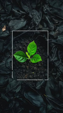 Close-up of a young green plant with a small glass bottle in a moist, natural setting, representing eco-friendly and sustainable themes. Ideal for environmental concepts.