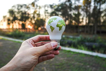 A person's hand gently holds a light bulb with a green world map design, set against a blurred background of lush greenery and a setting sun.