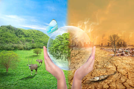 Global Warming and human waste ,Pollution Concept.Sustainability. showing the effect of arid land with tree changing environment, Concept of climate change.