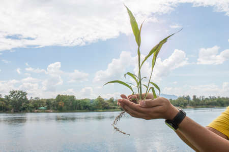 hands holding and protecting growing sprouts, carbon neutral bussiness concept, climate positive and net zero carbon emissions