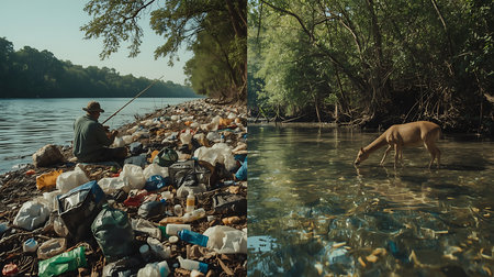 Nature contrast split image deer drinking vs man fishing plastic waste pollution