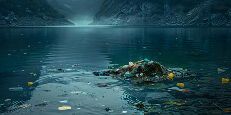Trash seen in polluted ocean waste floating in illuminated waters image. Concept Polluted Ocean, Trash in Water, Pollution Awareness, Ecological Impact, Marine Environment