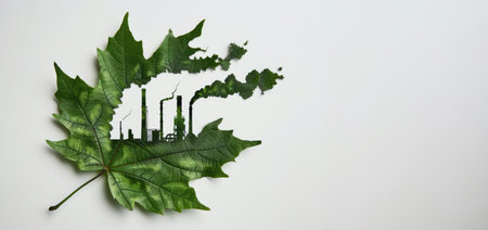 A leaf with an industrial plant cut out on it, environmental impact or global warming by depicting air pollution from industry concept
