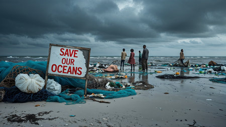Environmental awareness scene with a weathered sign reading Save Our Oceans placed on a polluted beach strewn with fishing nets and plastic waste. In the distance, people stand near the shoreline under dramatic storm clouds, symbolizing the urgency for ocean conservation and the fight against marine pollution.