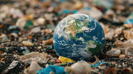 Powerful image showing planet Earth perched atop a pile of plastic waste emphasizing the contrast between the beautiful Earth and the surrounding pollution