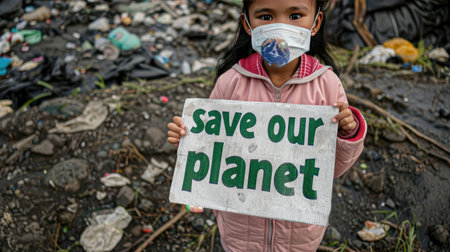A child in yellow and white mask holds up the sign save our planet against a background of garbage piles, plastic waste, garages, and old cars with a foggy sky