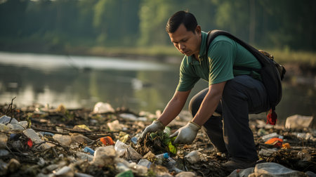 Man picking up plastic waste on the river bank. Environmental pollution concept.