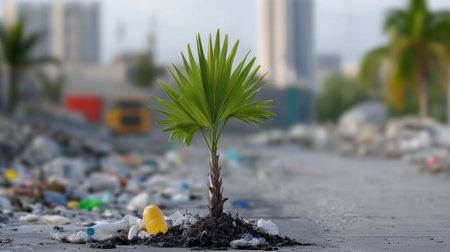 Striking contrast of green palm against a backdrop of plastic waste and pollution