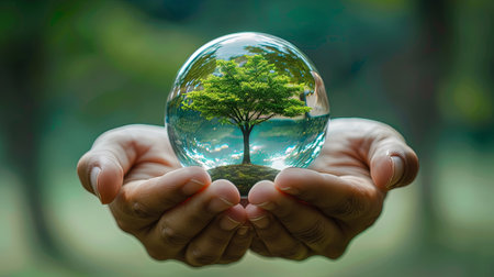 A hand cradles a transparent glass globe containing a small tree, set against a blurred green backdrop. The image features natural light and a shallow depth of field, highlighting the globe and tree's details. This conceptual composition could be used for illustrations related to sustainability or environmental themes.