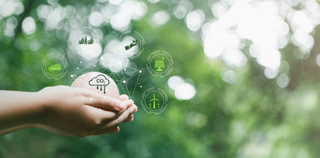 A hand holds several transparent spheres with environment-related symbols and green foliage. The composition features a blurred natural background with trees, showcasing vibrant green colors. The image highlights a concept related to environmental protection and sustainability. Suitable for use in various commercial and editorial contexts.