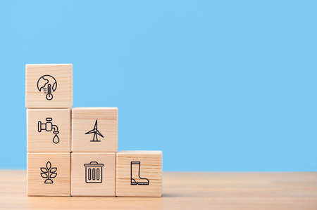 Set of environment, social, and governance ESG concept. The wooden block with thin line icons such as sustainable ecological, save water and energy, honest people.