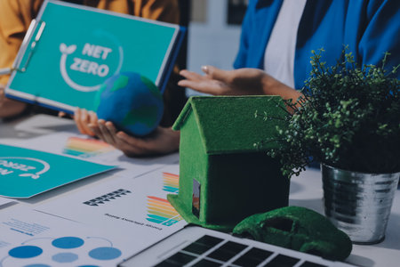Carbon offset price report CO2 emission. Future growth Net zero waste in ESG ethical SME office protect climate change global warming social issues project. Group of asia people Eco friendly SDGs plan