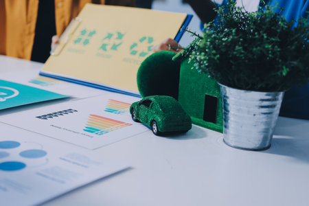 Green business transformation for environment saving and ESG business concept. Businessman using tablet to set corporate goal toward environmental friendly management and alternative clean energy use.