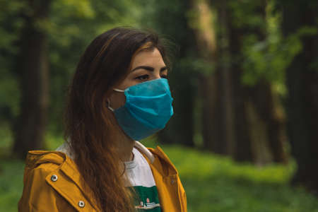 calm and sad girl portrait in respiration face mask in global pandemic Virus quarantine, park outdoor unfocused nature with fresh air environment background