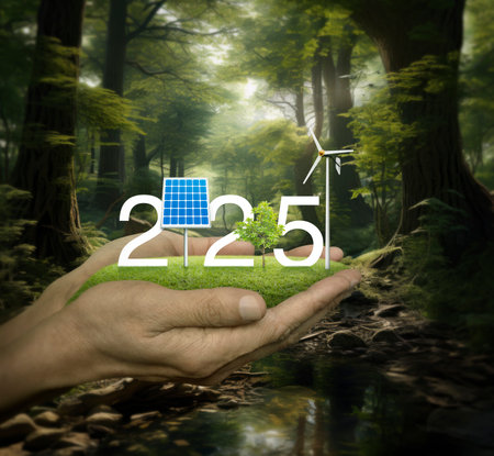 2025 with solar cell, wind turbine and growing tree on green grass field in hands over rill and forest in spring with sunlight shining through the trees, Happy new year 2025 ecological cover concept, Generative AI