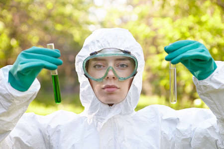 Pond water pollution concept. Scientist takes samples of dirty water from a pond into a test tube.