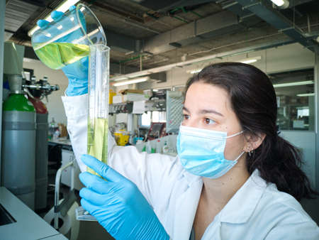 Young female lab technician making up to volume with yellow liquid into a measuring cylinder. Researcher and laboratory concepts.