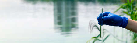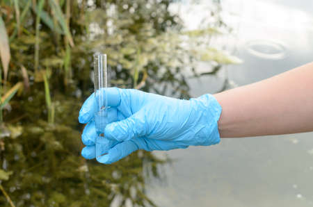 A water sample from the river. Hand in glove collects water in a test tube. ecology concept