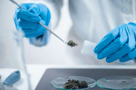 Close-up scientist examining sampling of toxic chemicals on polluted ground