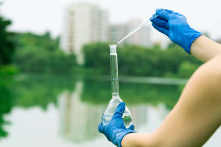 Sampling from open water. A scientist or biologist takes a sample of water from a city reservoir. A sample of water in a round chemical flask with a pipette.