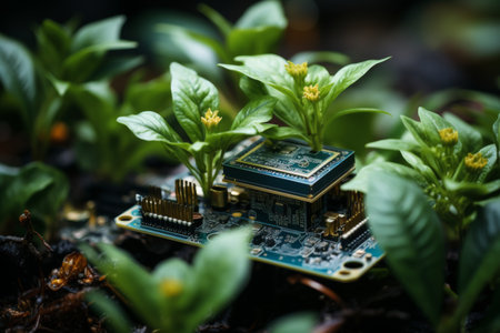 A unique blend of technology and nature featuring a detailed circuit board surrounded by lush green plants, symbolizing harmony between innovation and environment.