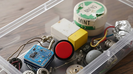 A clear plastic box holds assorted electronic components, wires, a circuit board, and a red button, useful for hobbyists or repair tasks.