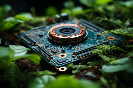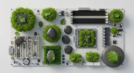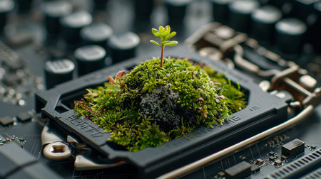 Conceptual image of a motherboard adorned with moss, stones, and leaves, symbolizing sustainable technology and the integration of nature with electronics.