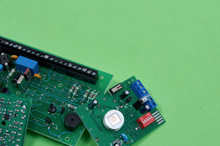 Electronic printed circuit boards on a green background. Recycling of electronic waste