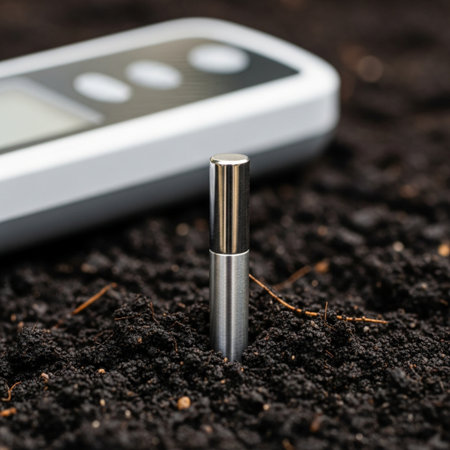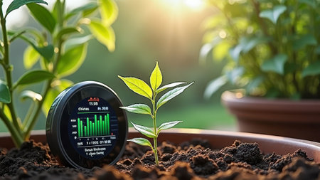 Smart garden technology with soil moisture sensor and young plant in sunlit garden. That the image is generated using AI.
