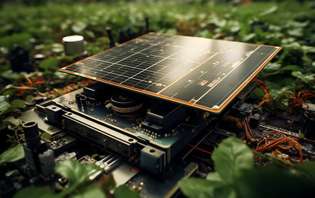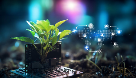 digital transformation depicts a futuristic green plant intertwining with a computer circuit board, symbolizing the harmonious coexistence of nature and technology.
