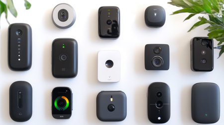Clean flat lay of smart home accessories including camera, thermostat, and assistant device, on a white surface