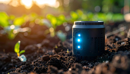 At the break of dawn, a futuristic IoT sensor with glowing blue lights activates in the fertile soil of a smart farm. This advanced agritech device gathers crucial data, monitoring soil health and moisture to ensure optimal growth for the young seedlings, heralding a new era of sustainable and efficient agriculture.
