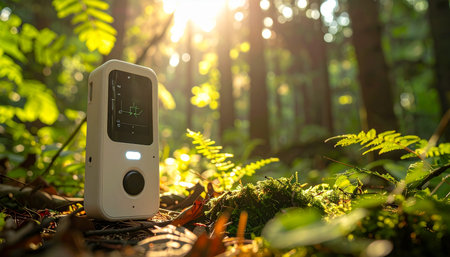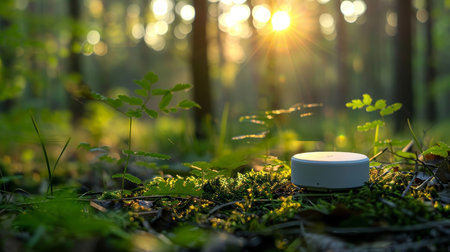 A smart home device placed among forest undergrowth, illuminated by the warm glow of the setting sun, symbolizing technology in harmony with nature.