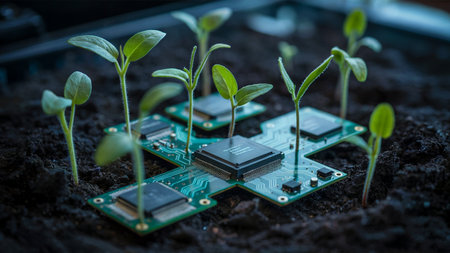 Green Technology Seedlings Growing From Circuit Board