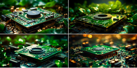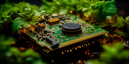 Close up of green microchips and green leaves on the motherboard