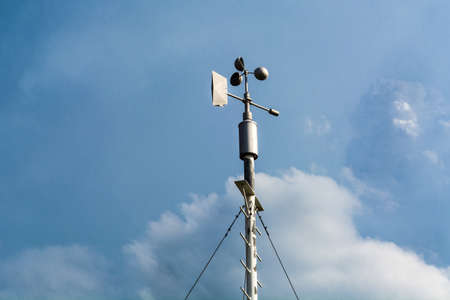 Professional wind weather vane and cloudy dramatic blue sky in weather station. Meteorology concept. Automatic weather station for monitoring ambient air pressure, humidity, wind speed and direct