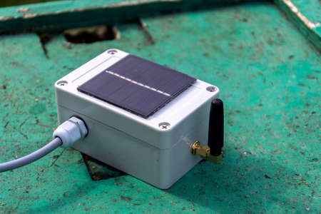 White transmitter with small solar panel and bees monitoring system on green wooden beehive, smart technology iot application