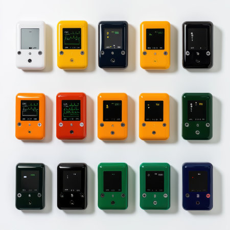 Colorful array of electronic devices displaying digital screens, showcasing innovative technology in a modern design style with various vibrant hues