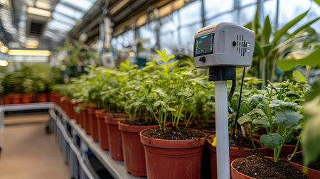 The image showcases a modern monitoring device in a greenhouse, surrounded by vibrant, healthy potted plants, emphasizing technology's role in effective gardening and plant growth.