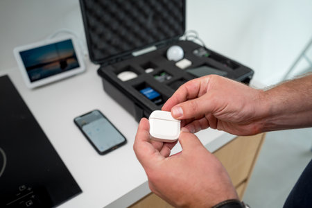 Camera modules in scientist hands. Different sensor and technology smartphone small cameras in laboratory.