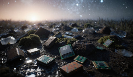 Computer chips lie on the ground, surrounded by moss and crystals under a starry sky during twilight.