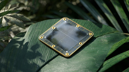 Close up of solar panel on a green leaf in the garden.