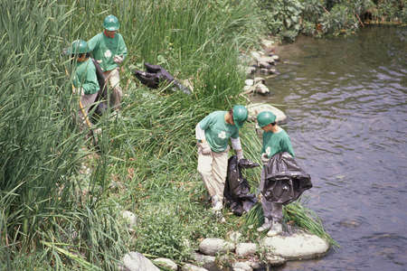 Group of volunteers collecting plastic waste on riverbank, working together to clean up environment