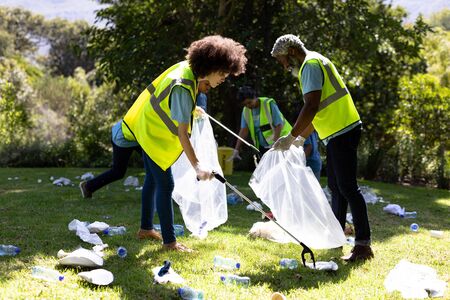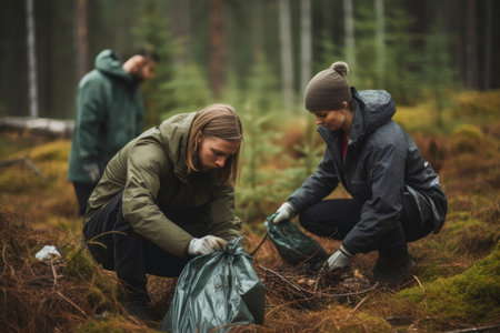 Diverse group of volunteers cleaning up forest from waste, community service concept.