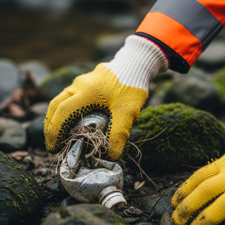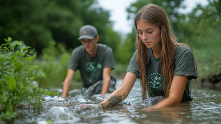A group of young environmental volunteers collecting trash from a riverbank, wearing green uniforms and gloves, focusing on preserving nature.