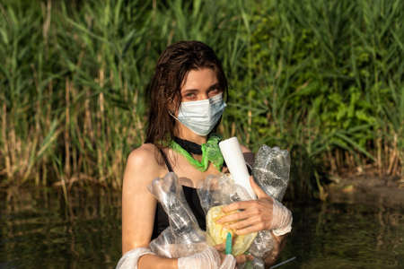 A female volunteer holds plastic garbage in her hands, collecting garbage on a dirty beach. The problem of environmental pollution