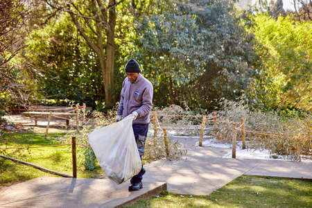 Lisbon, Portugal - January, 2018. Gulbenkian park and garden. A worker from the garden carries a bag of garbage. A man in a hat carries a large plastic bag