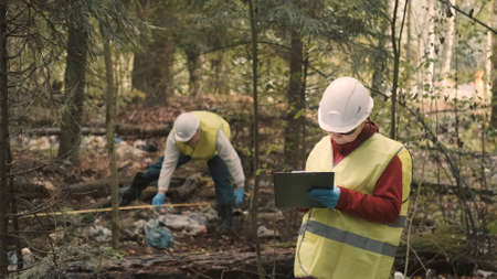 Ecologist man in workwear and helmet measures diameter of plastic dump, with tape measure in forest, and woman documents offense and issues fine. Concept of pollution of natural parks and woods