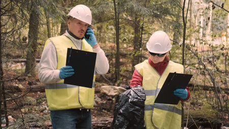 Man and woman environmentalists in workwear and helmets document offense - forest pollution and issue fine. Concept of pollution of natural parks, woods and nature reserves with non decomposable waste