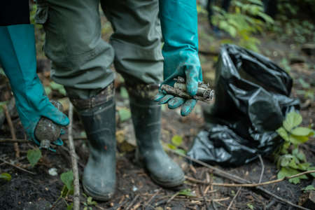 Volunteer collecting plastic trash in the forest. The concept of environmental conservation. Global environmental pollution. Cleaning the forest